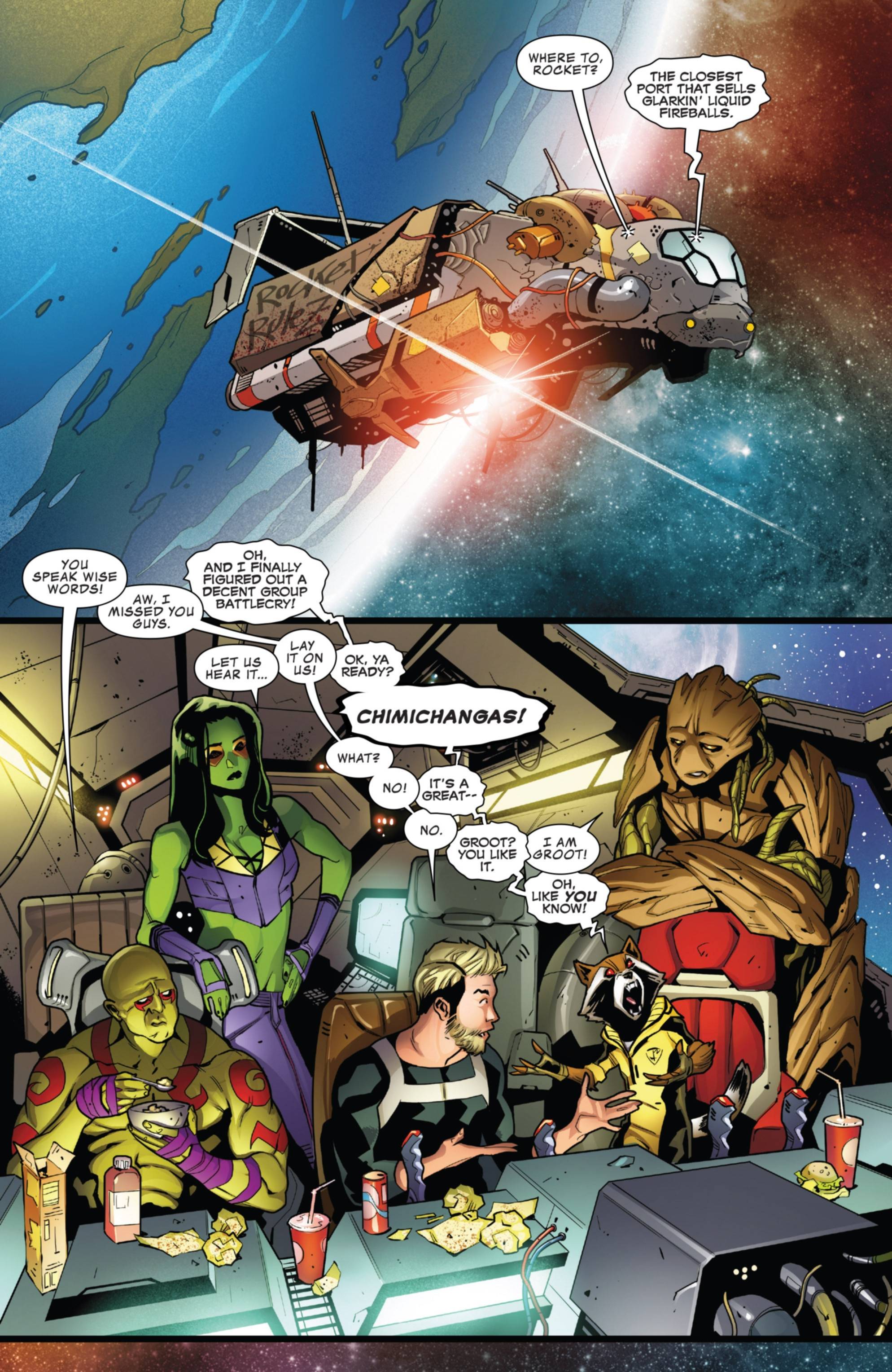 In Guardians of the Galaxy #15 by Brian Michael Bendis, Ed McGuinness, Kevin Maguire, Mark Bagley, Sara Pichelli, Star-Lord voiced his resolute disapproval of the word in a comedic moment with his teammate, Rocket Racoon. Rocket has come up with what he feels is a decent battle cry for the team. He suggests "Chimichangas!" as the perfect line before a fight, but Peter Quill vehemently turns Rocket down. Poor Rocket can't even get support from his longtime confidante, Groot, who also rejects his friend's pitch.